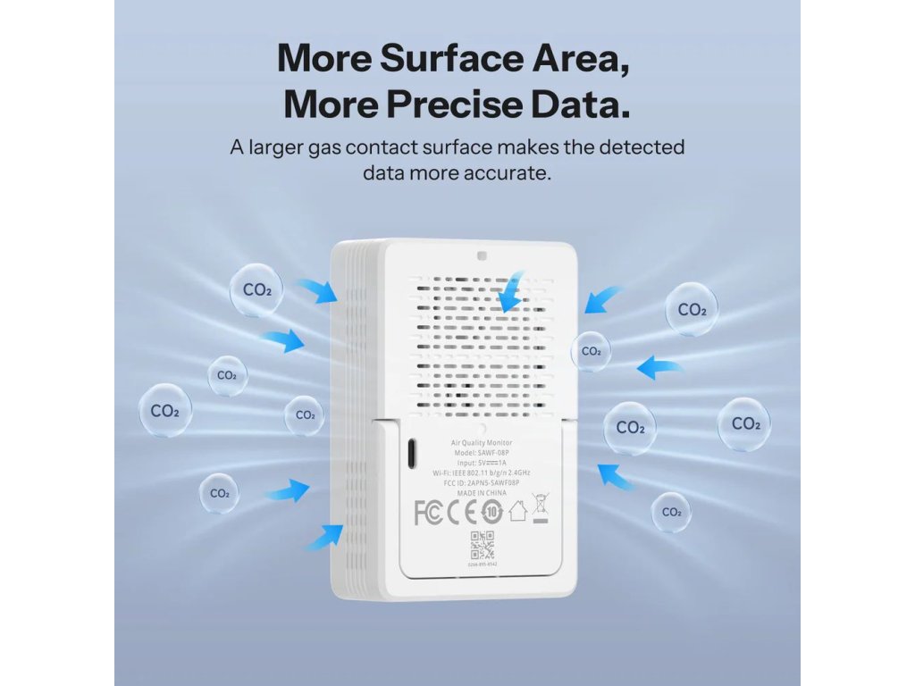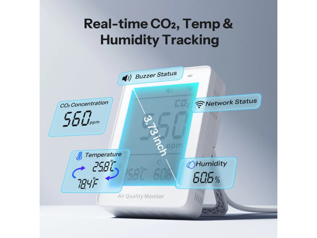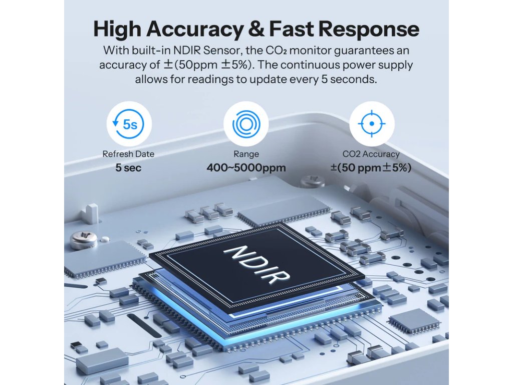 🛠 Technológia senzora: NDIR CO₂ senzor (±50 ppm + 5 %); obnovovacia frekvencia: 5 s